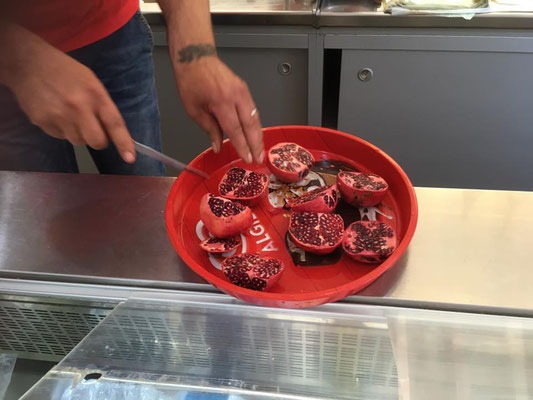 甘酸っぱくておいしい~。ショーケースに積んであるザクロを半分に切ってふんだんに使った贅沢なジュース。